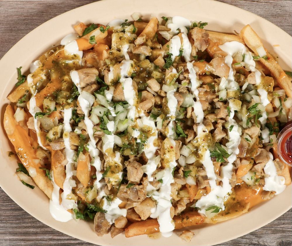 French fries topped with your choice of meat, nacho cheese, Jack cheese, sour cream, onion, cilantro, and salsa. Served with a side of ketchup.
