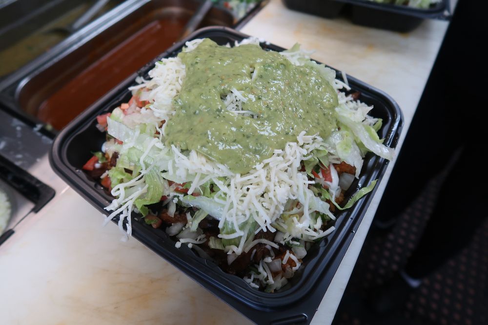 A deep-fried flour tortilla basket is filled with your choice of meat, rice, whole pinto beans, onion, cilantro, salsa, lettuce, sour cream, guacamole, tomatoes, and Jack cheese.